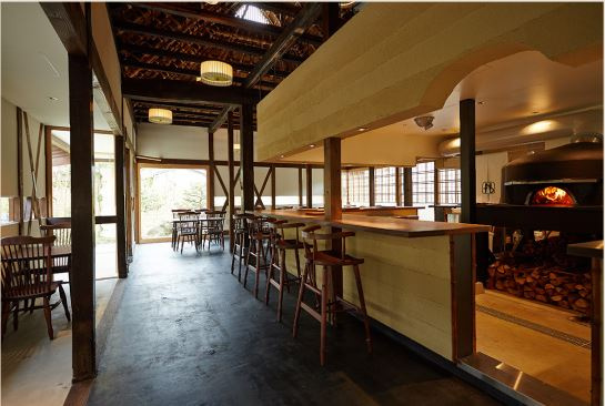 厨房の中央に薪窯が鎮座するカフェ